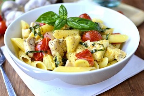 This baked ziti recipe requires only 6 ingredients — pasta, chicken, tomato sauce, mozzarella, parmesan, and basil. Chicken and cheese contain fill-you-up protein and basil adds delicious flavor with no added calories. Plus, it takes only 15 minutes to prep!