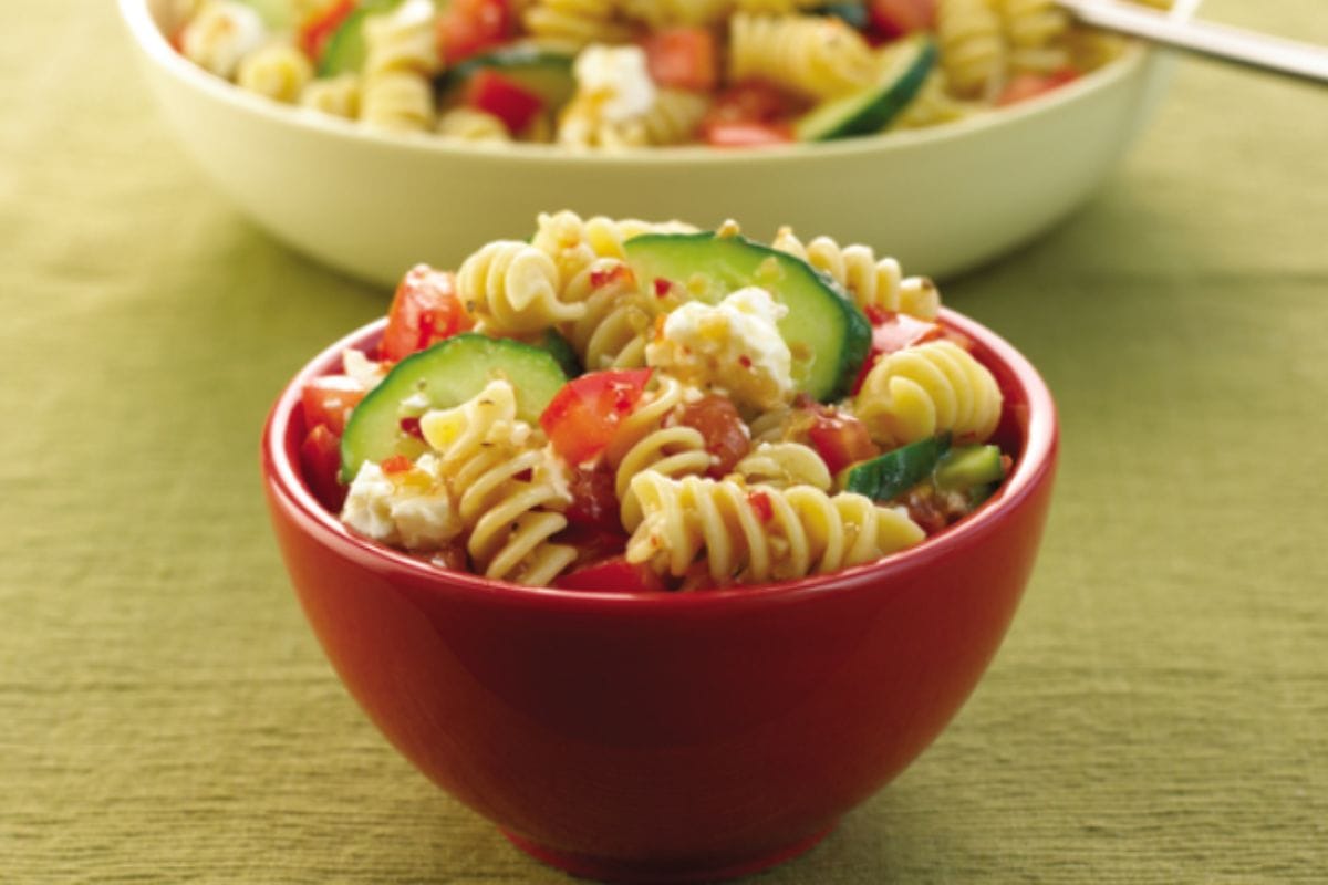 - In a large bowl, combine the pasta with the tomato and cucumber. Gently fold in the feta and toss with the dressing to coat. Serve at room temperature or refrigerate for 30 minutes before serving.