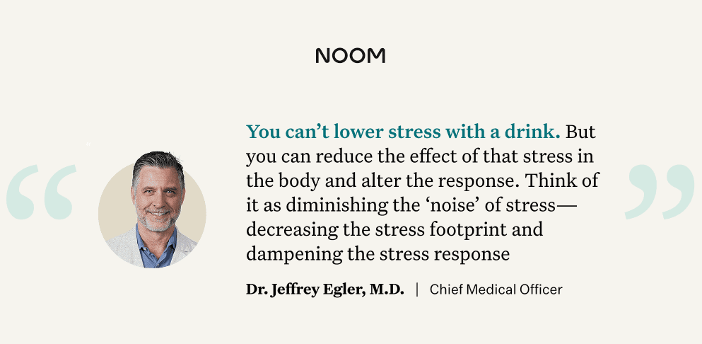 “You can’t lower stress with a drink,” says Dr. Jeffery Egler, MD, Chief Medical Officer at Noom. “But you can reduce the effect of that stress in the body and alter the response. Maybe think of it as diminishing the ‘noise’ of stress—decreasing the stress footprint and dampening the stress response.”