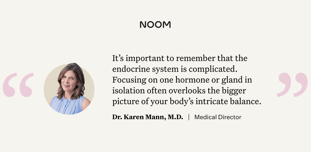 “Recently, I’ve noticed more and more patients expressing concern about their cortisol levels and stress,” says Dr. Karen Mann, MD, Medical Director at Noom. “It’s important to remember that the endocrine system is a complicated and interconnected structure that works in harmony. Focusing on one hormone or gland in isolation often overlooks the bigger picture of your body’s intricate balance.”