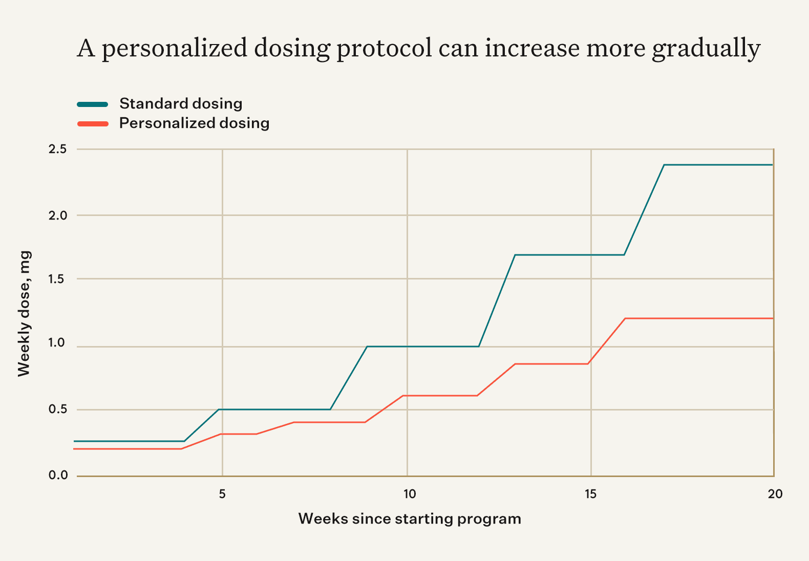 An illustrative personalized protocol with the Noom Med GLP-1Rx Program increases dosages to the lowest effective dose for each individual, compared to a nearly exponential increase in dosages from standard approaches.