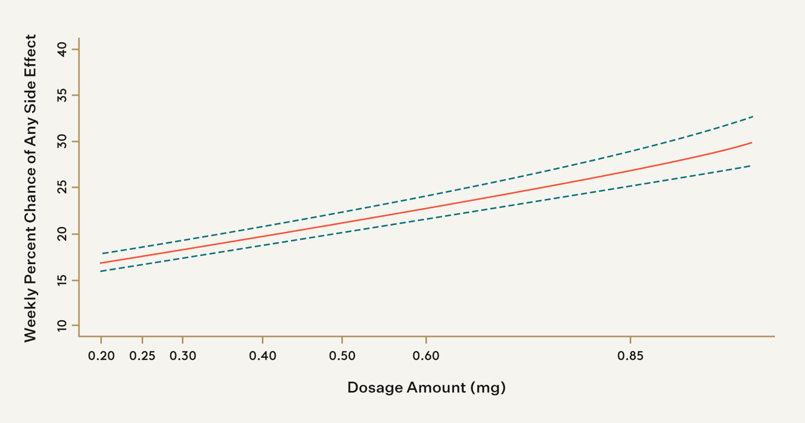 Internal Noom data shows that Noom GLP-1Rx Program members self-report higher rates of side effects at higher dosages. We analyzed the weekly incidence of side effects during the first two weeks that a participant recorded a given dose amount, using a Bayesian logistic mixed-effects model.