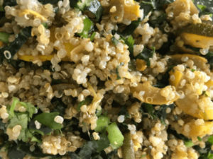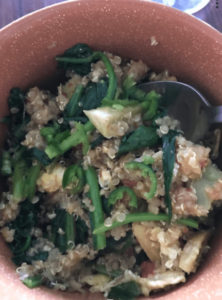 2. Wasche und koche in einem kleinen Topf das Quinoa. Wenn es nach 20 Minuten fertig ist, brate es mit Kokosöl (oder Olivenöl), Frühlingszwiebeln ( oder normalen Zwiebeln), Knoblauch, Ingwer in einer Pfanne etwas an, gerne kannst du auch etwas Ananas und Chili-Flocken hinzufügen. Würze das ganze mit Sojasoße oder Salz, Pfeffer, etwas Zitronensaft und frischen oder getrockneten Gewürzen nach Belieben.
