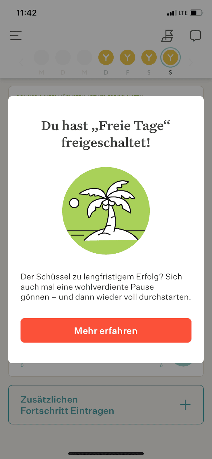 Du kannst auf deine freien Tage zugreifen, wenn du sie zum ersten Mal frei schaltest und auch, indem du auf ‘Fortschritt’ und dann auf Trends‘ und dann auf die Palme tippst. Hier kannst du den Stand deiner freien Tage einsehen und sie planen oder absagen.