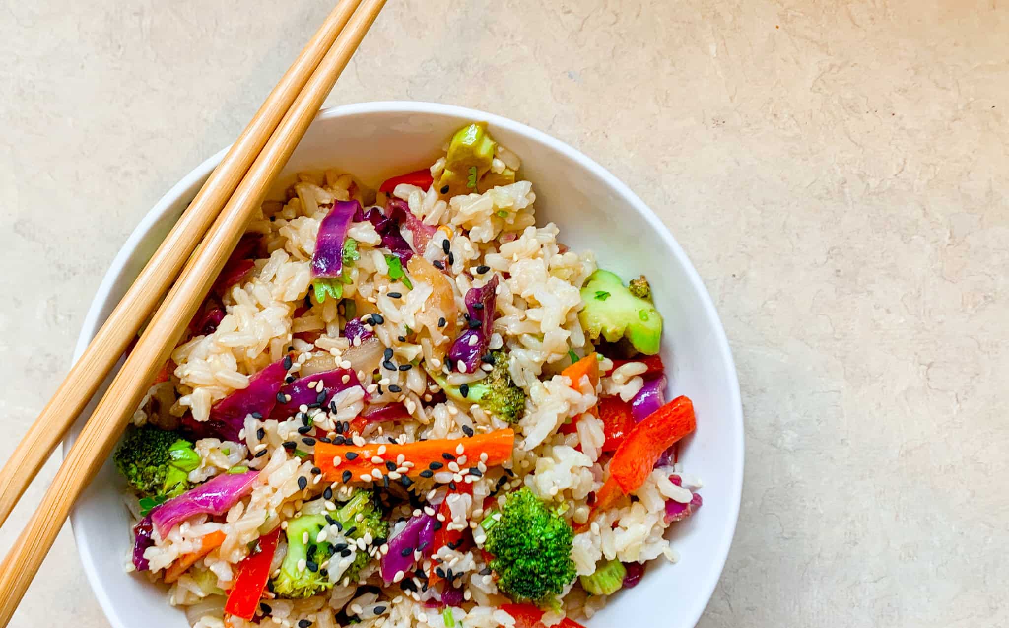 - 10 minutos antes de que termine de cocerse el arroz, calentar el aceite en una sartén o wok y agregar todas las verduras excepto la col morada. Sofreír alrededor de 5 minutos.